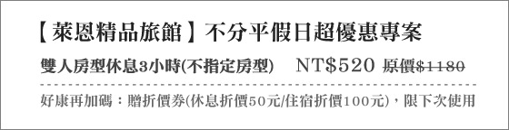 商品訊息簡述: 只要520元(雙人價)即可享【萊恩精品旅館】原價1180元不分平假日超優惠專案:雙人房型休息3小時(不指定房型)。好康再加碼:贈折價券(休息折價50元/住宿折價100元), 限下次使用!